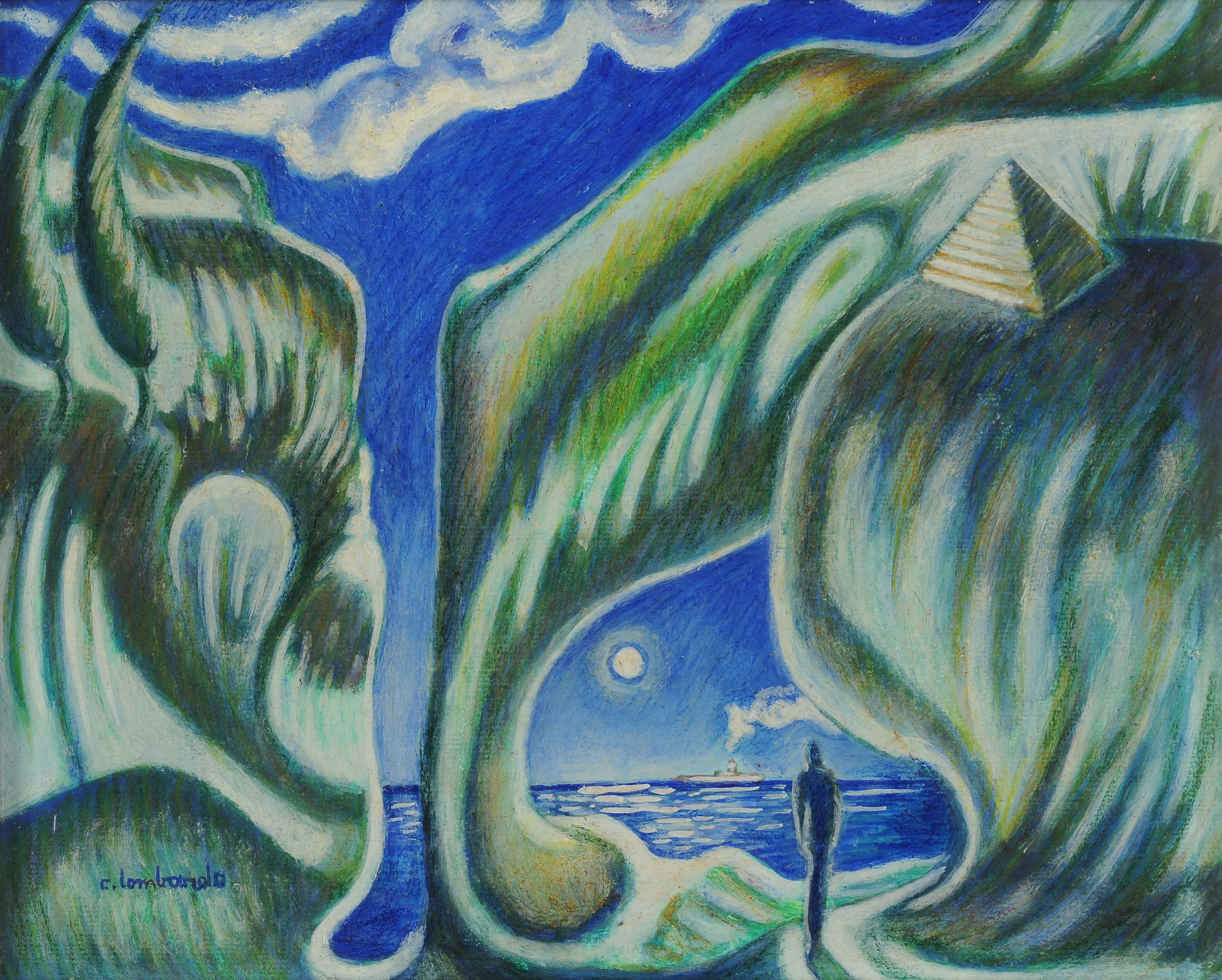 Pastelli ad olio e tecniche miste su carta · un universo simbolico personale: la piramide, la luna, il cipresso, la figura volante